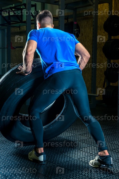 Бодибилдер тренируется в тренажерном зале с тяжелым колесом, вид со спины