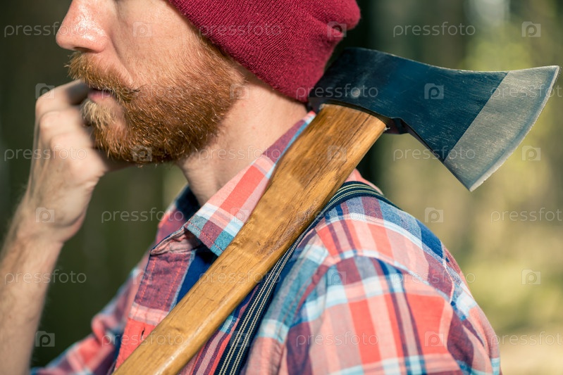 Лесохозяин с красной бородой и топором на плече ходит по лесу, крупный портрет