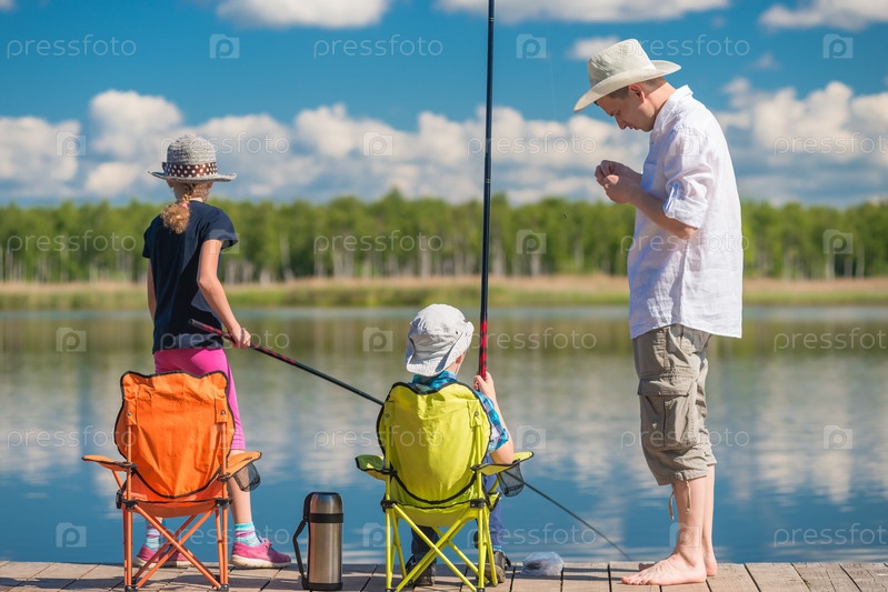 Отец учит своих детей ловить рыбу с помощью удочка на пирсе у озера