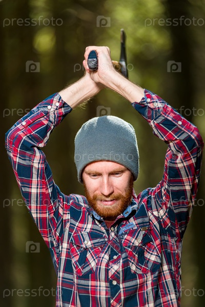 Деревосек, работающий с топором, вертикальный портрет в лесу