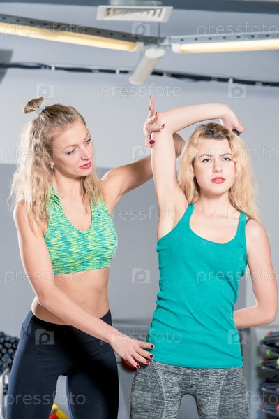 Вертикальный фото персональный тренер помогает женщине правильно держать спину, снимая в тренажерном зале