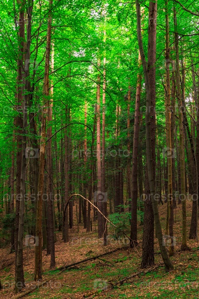 Вертикальная фотография стволов высоких деревьев в смешанном лесу
