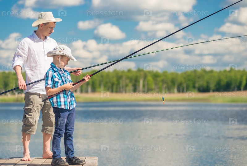 Отец и сын с рыболовными удочками на деревянном пирсе возле озера в солнечный день