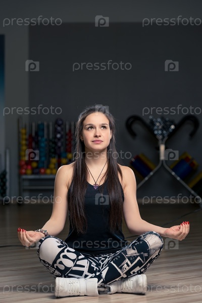 Красивая брюнетка занимается йогой в тренажерном зале, лотосная поза