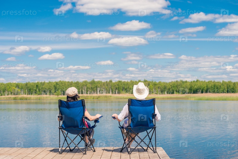 Супружеская пара, сидящая на стульях возле живописного озера на пирсе