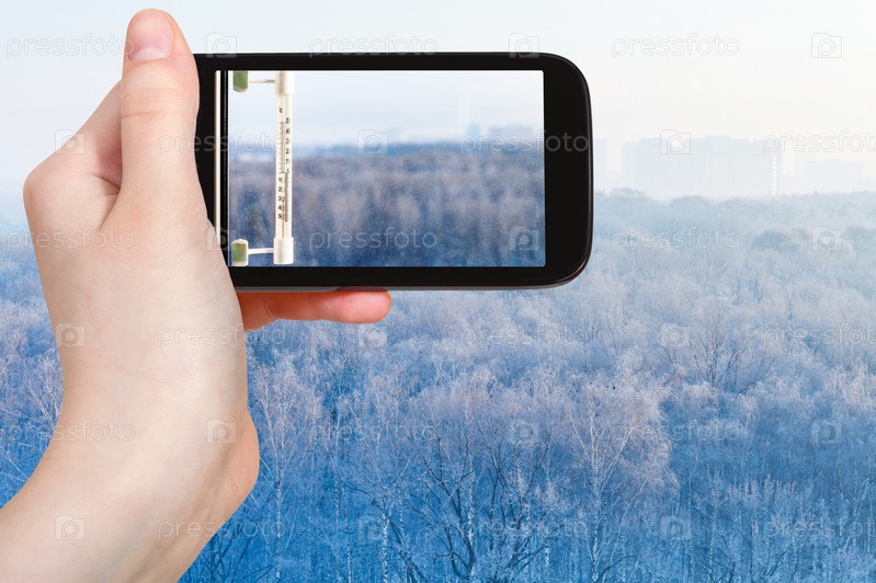 Турист фотографирует термометр в холодный зимний день