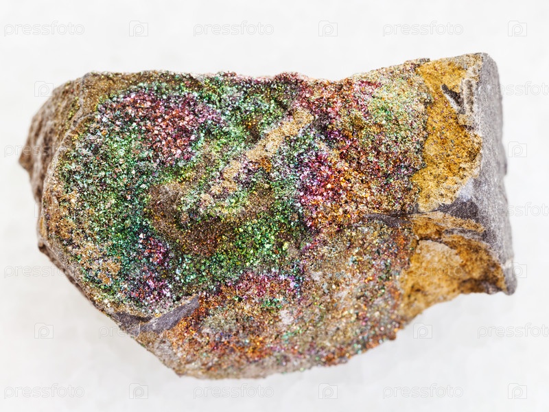 Грубый радужный пиритовый камень на белом мраморе