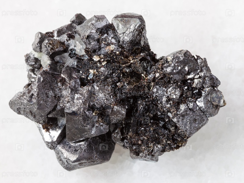 Грубый кристаллический магнитный камень на белом мраморе