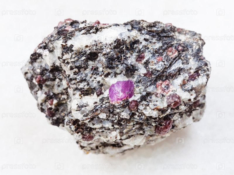 Необработанные кристаллы корунда в гнейсском камне на белом