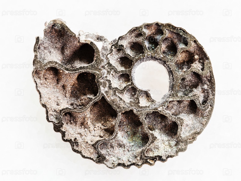 Полированная половина ископаемого аммонита на белом