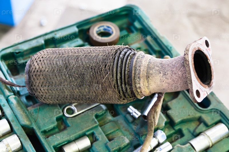 Старый сгоревший муфлер на наборе инструментов