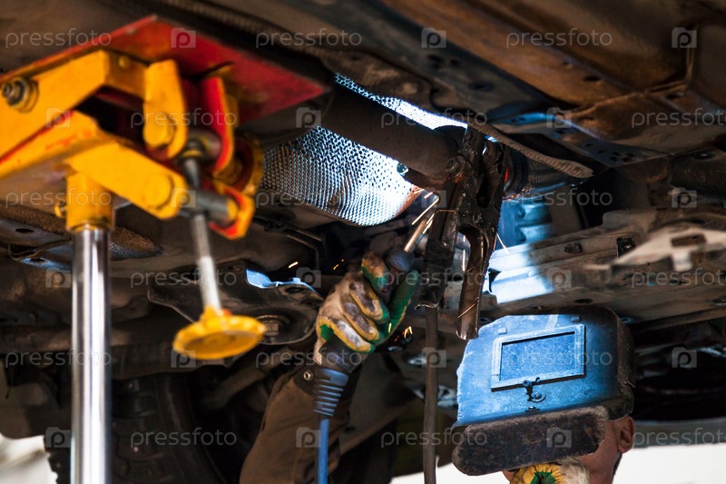 Сварщик ремонтирует глушитель с помощью аргоновой сварки