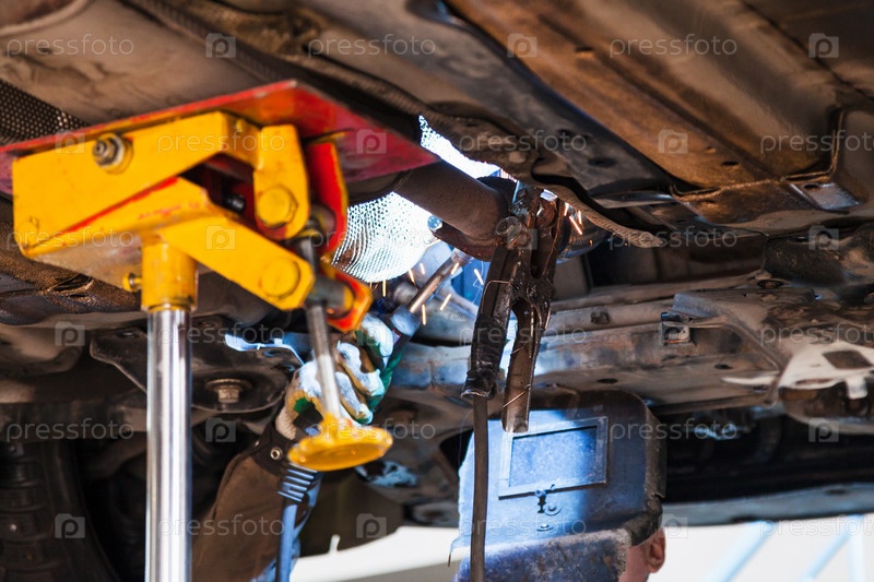 Сварщик исправляет глушитель на выхлопной трубе