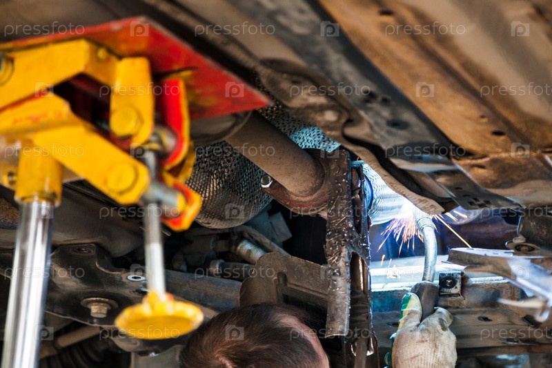 Работник сваривает глушитель на машине с помощью аргоновой сварки