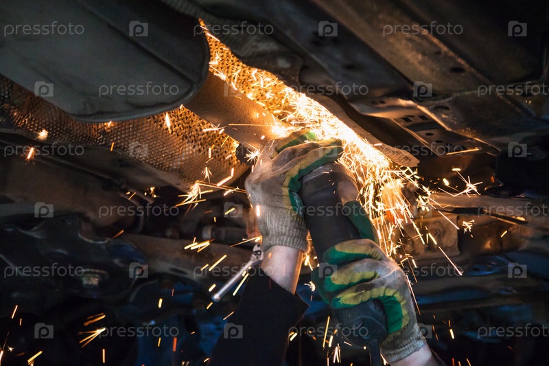 Механик режет старый муфлер на машине с помощью углового мельчика