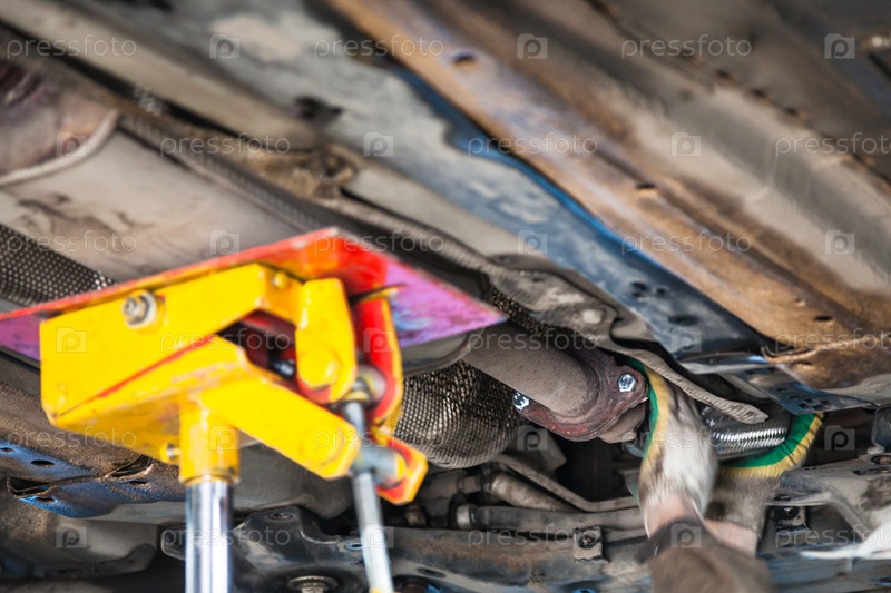 Механик исправляет трубу глушителя на машине