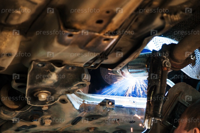 Сварщик сваривает глушитель на машине с помощью аргоновой сварки