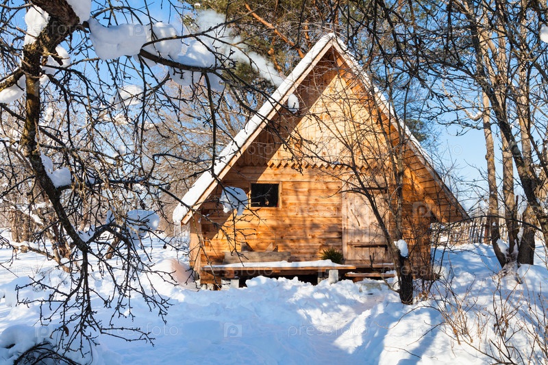Небольшой деревянный коттедж в заснеженном саду