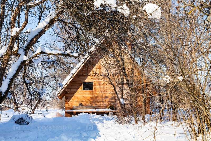 Деревянный коттедж в снежном саду зимой