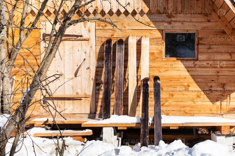 Широкие охотничьи лыжи перед деревянным домом