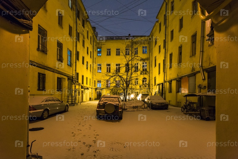 Городской двор в городе Санкт-Петербург в ночное снегопад
