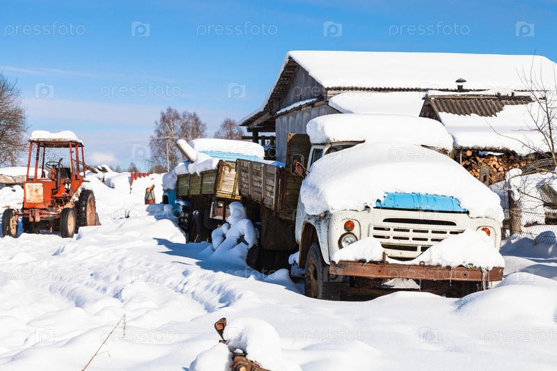 Заснеженный транспорт на улице в деревне
