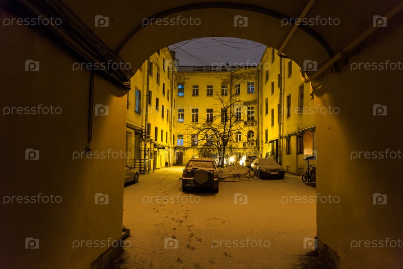 Городской дворик в Санкт-Петербурге во время ночного снегопада