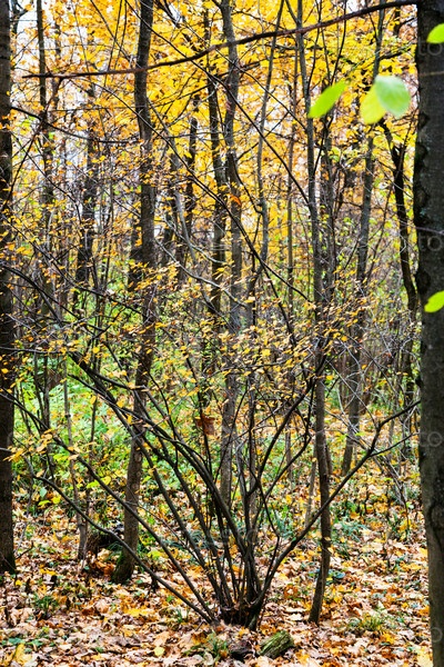 Куст и упавшие листья в городском парке осенью
