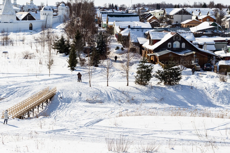 Дома и монастырь рядом с замерзшей рекой в Суздале