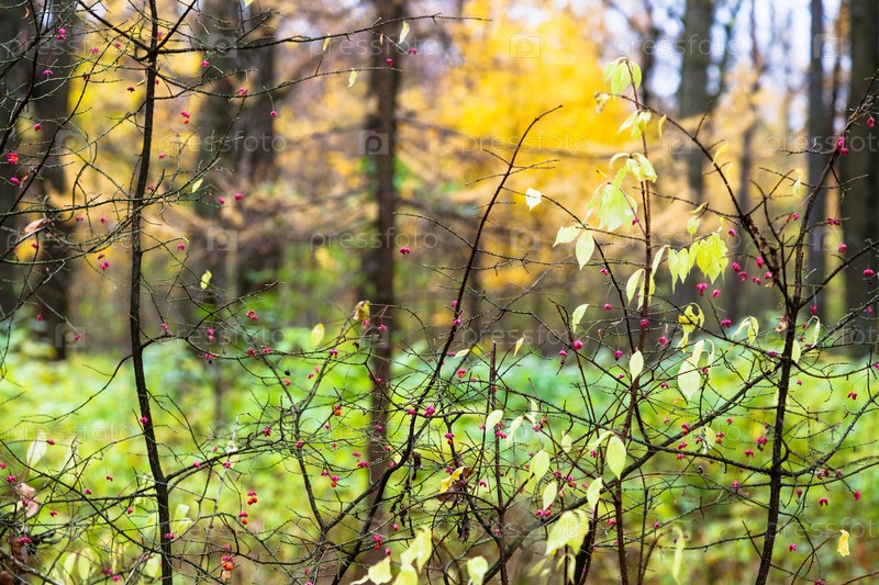 Ядовитые спелые плоды на кусте эонимуса осенью