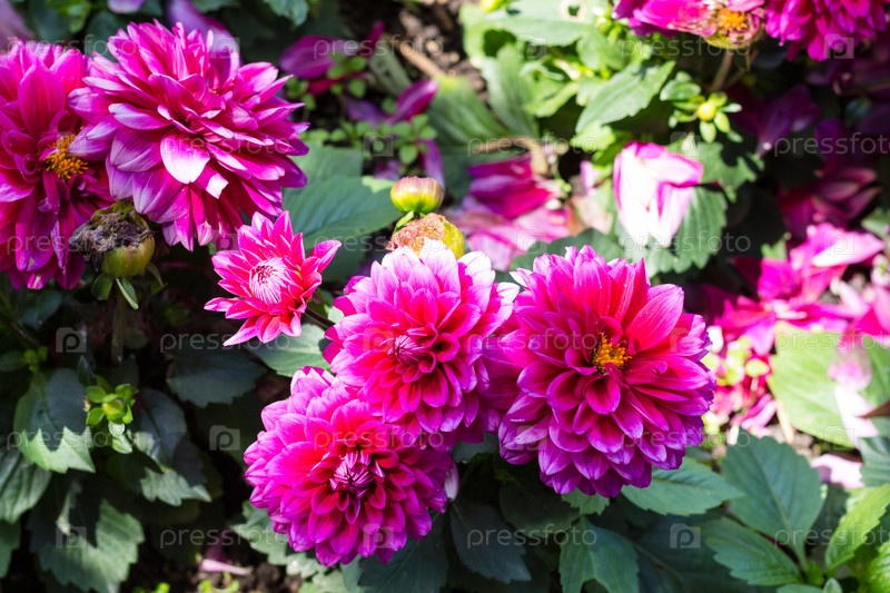 Цветки розовой даллии на зеленом кусте в саду