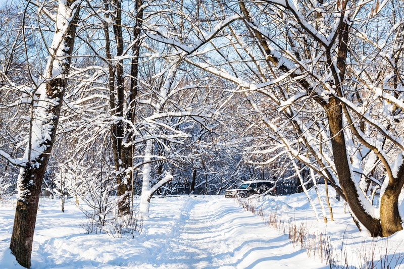 Заснеженная тропа к городскому парку зимой