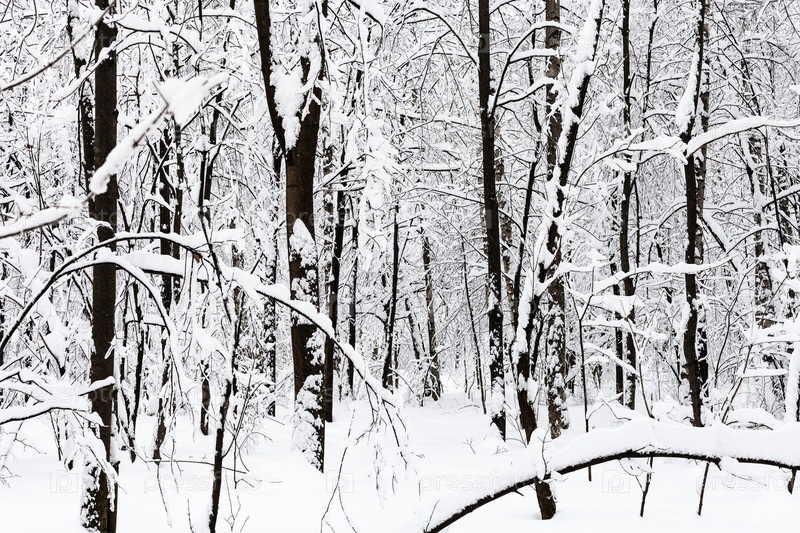 Черные стволы деревьев в снежном лесу в пасмурный день