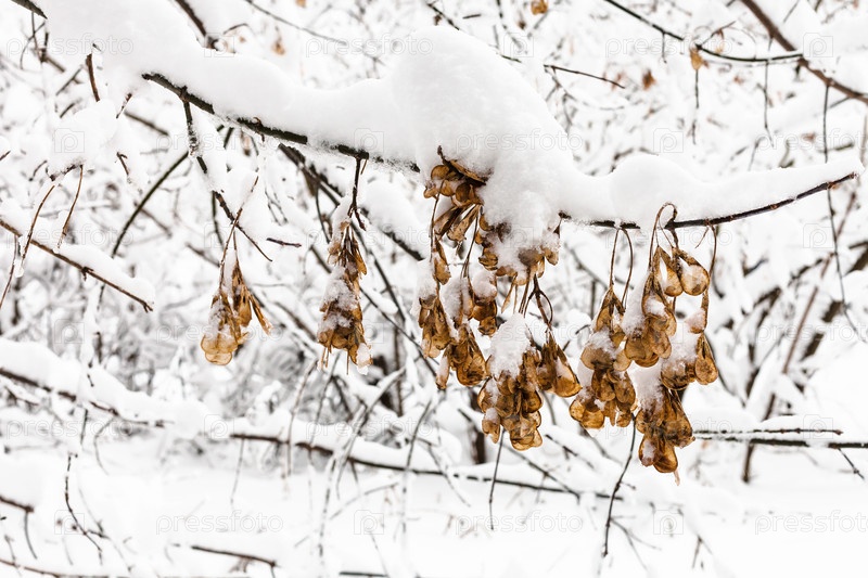 Сушеные кленовые семена на ветке в снежном лесу