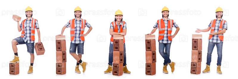 Строитель с глиняными кирпичами, изолированными на белом