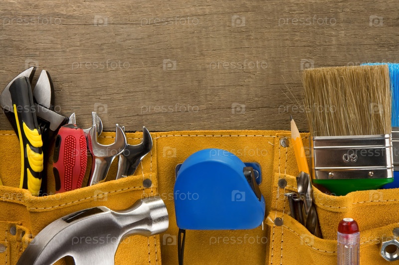 Инструменты в строительном ремне на дереве