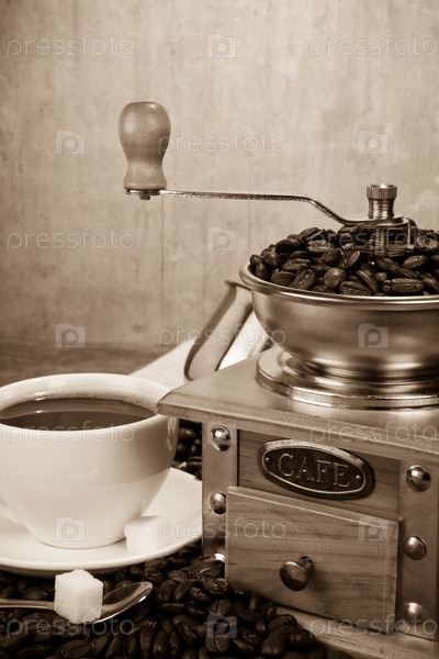 Чашка кофе, бобы и мельница