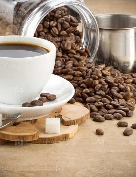 Чашка кофе и банка с бобами