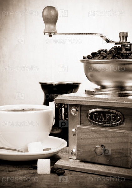 Чашка кофе, бобы и мельница