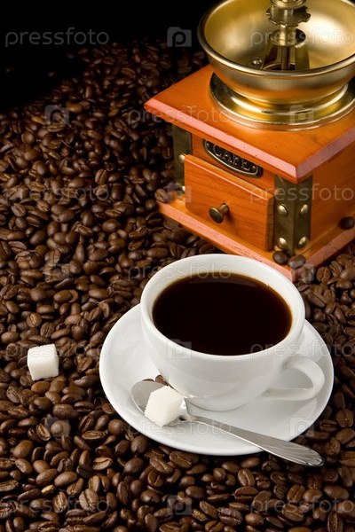 Чашка кофе, бобы и мельница