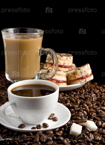 Чашка, полная кофе и пирогов бобы изолированные на черном