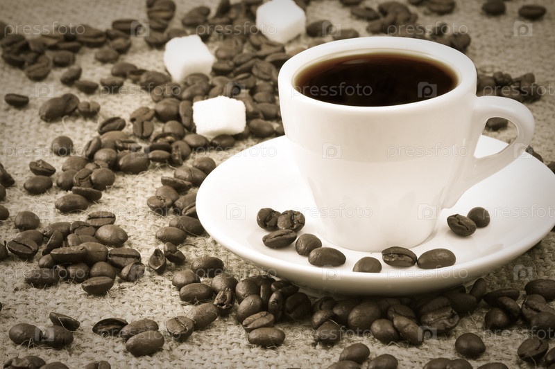 Чашка кофе, бобы на мешке
