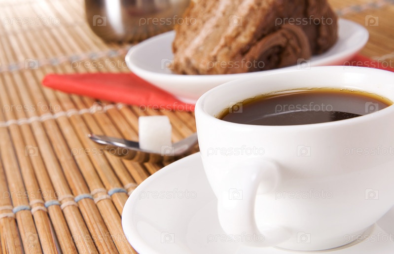 Чашка кофе, горшок и пирог на столе