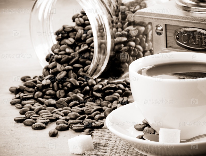 Чашка кофе и бобы на сепии