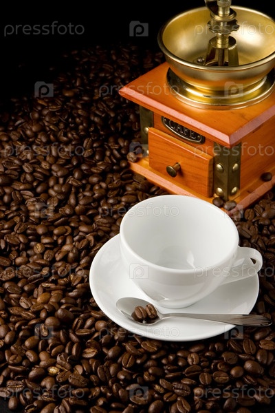 Пустой стакан и мельчик на кофейных зернах