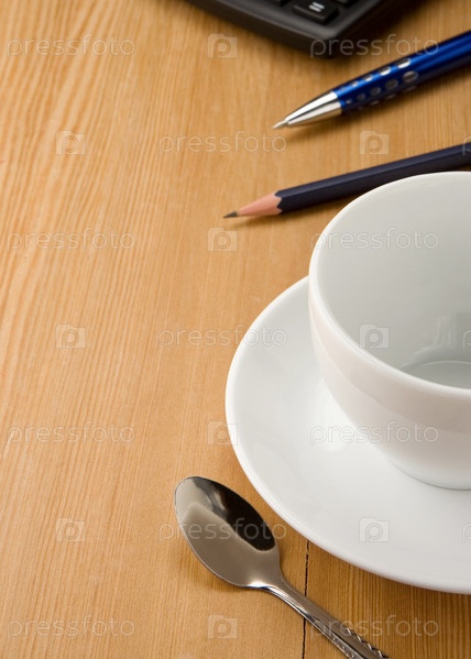 Ручка, калькулятор и чашка кофе на дереве