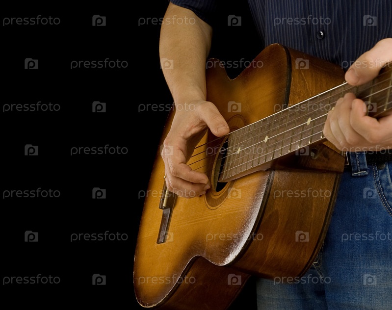 Человек, играющий на гитаре изолированный на черном