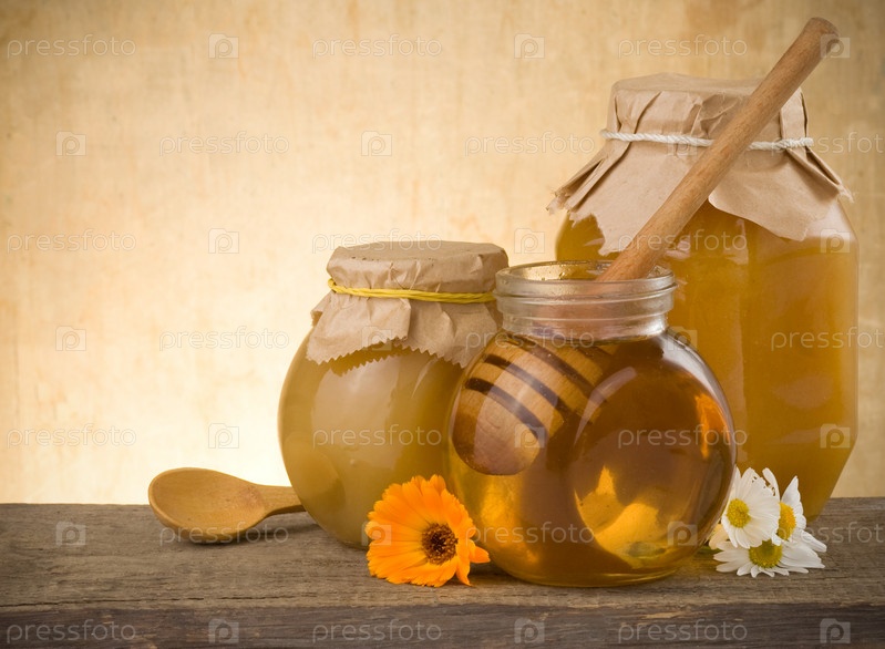 Банка с медом и цветами на дереве