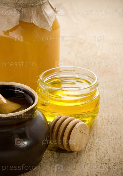 Мед в банках и горшок на дереве