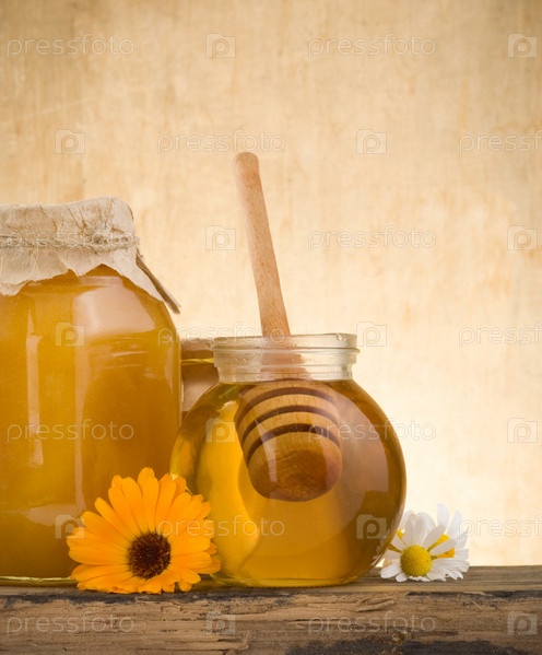 Стеклянный горшок, полный меда и палочки
